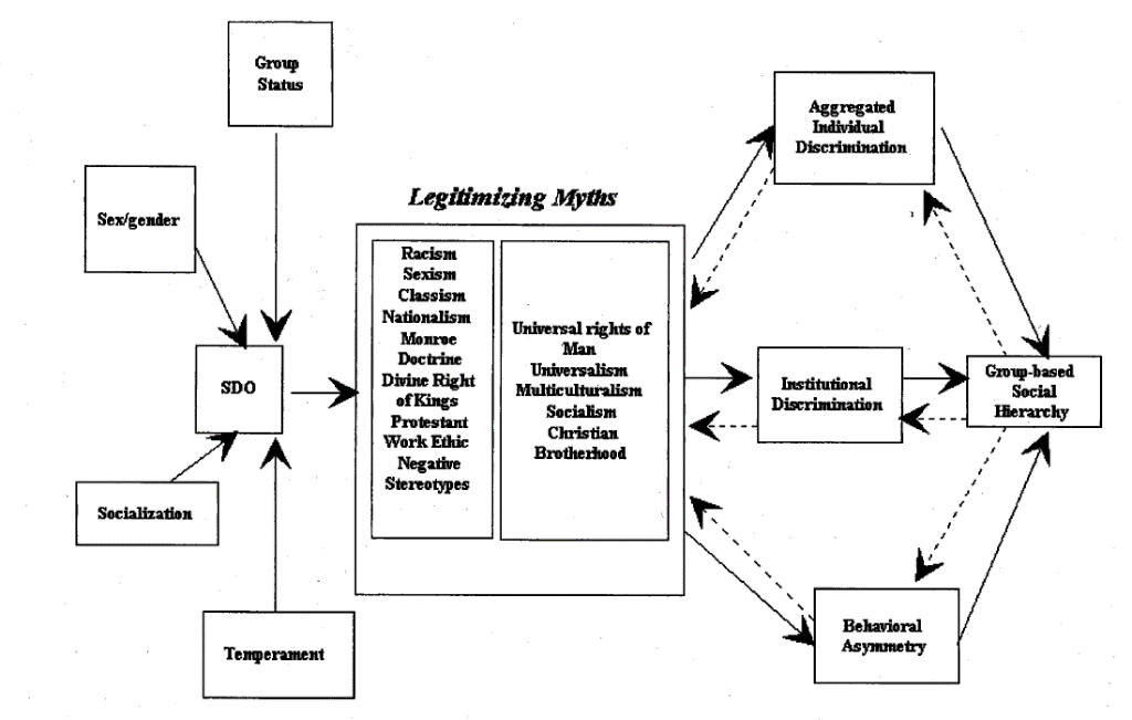 SDT sees societies as dynamic systems in which group-based hierarchy is the net effect of behavior and decision-making at various societal levels, including aggregated individual discrimination, aggregated institutional discrimination, and behavioral asymmetry among groups at different levels of the hierarchy.[50] Behavioral asymmetry refers to group differences in behavior between dominant and subordinated groups as a result of their fundamentally different social circumstances, such that dominant groups “behave in ways that are more beneficial to themselves” compared to subordinate groups.[51] These processes are mediated by legitimizing ideologies or “myths,” i.e., “attitudes, values, beliefs, stereotypes, and ideologies that provide moral and intellectual justification for the social practices that distribute social value within the social system.”[52]