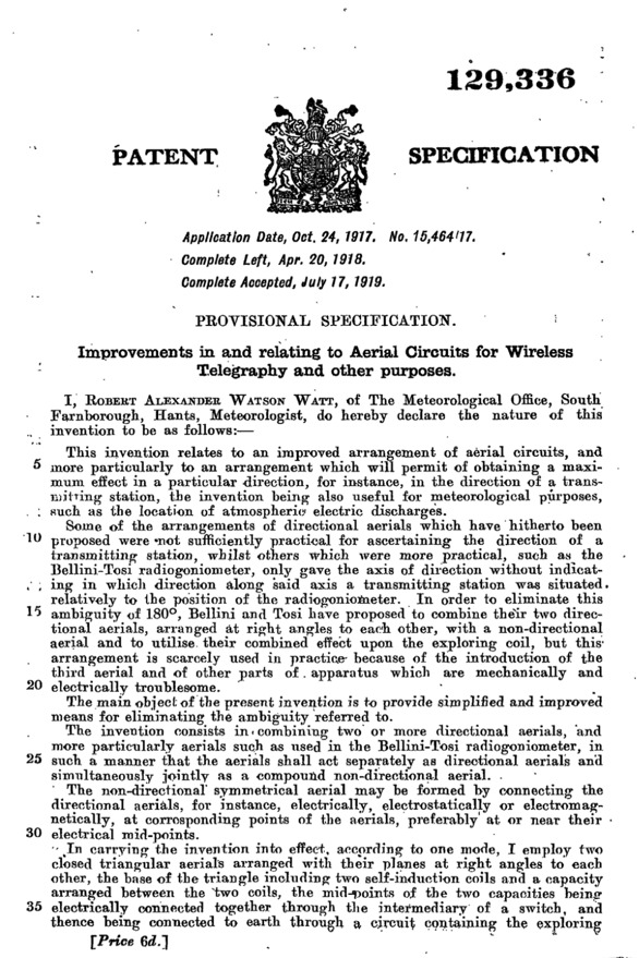 G.B. Patent No. 129,336; Espacenet, *“*Robert Alexander Watson Watt”, 18 results (Sep. 9, 2025) (on file with the Houston Law Review) (showing eighteen patents between 1917 and 1938 that laid the groundwork for radar technology).