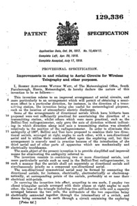 A few years later, in 1917, the British inventor Robert Watson-Watt filed for his first of several patents, laying the groundwork for radar technology.[71] The first page of his earliest patent specification is shown below. Radar was widely adopted by militaries in the 1930s.[72]