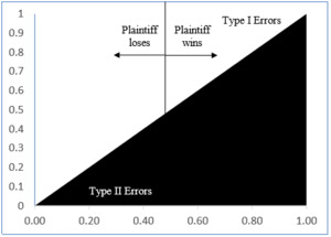 While drawing a line in the middle may seem simplistic, as Figure 2 illustrates, under our assumptions, it reaches the right outcome 75% of the time. In the other 25%, the legal system reaches the wrong outcome. These mistakes are divided evenly between: (a) Type I errors in which a plaintiff wins under the rule, but a fully informed social welfare analysis establishes that the plaintiff should lose; and (b) Type II errors in which a plaintiff loses under the rule, but a fully informed social welfare analysis establishes that the plaintiff should win.